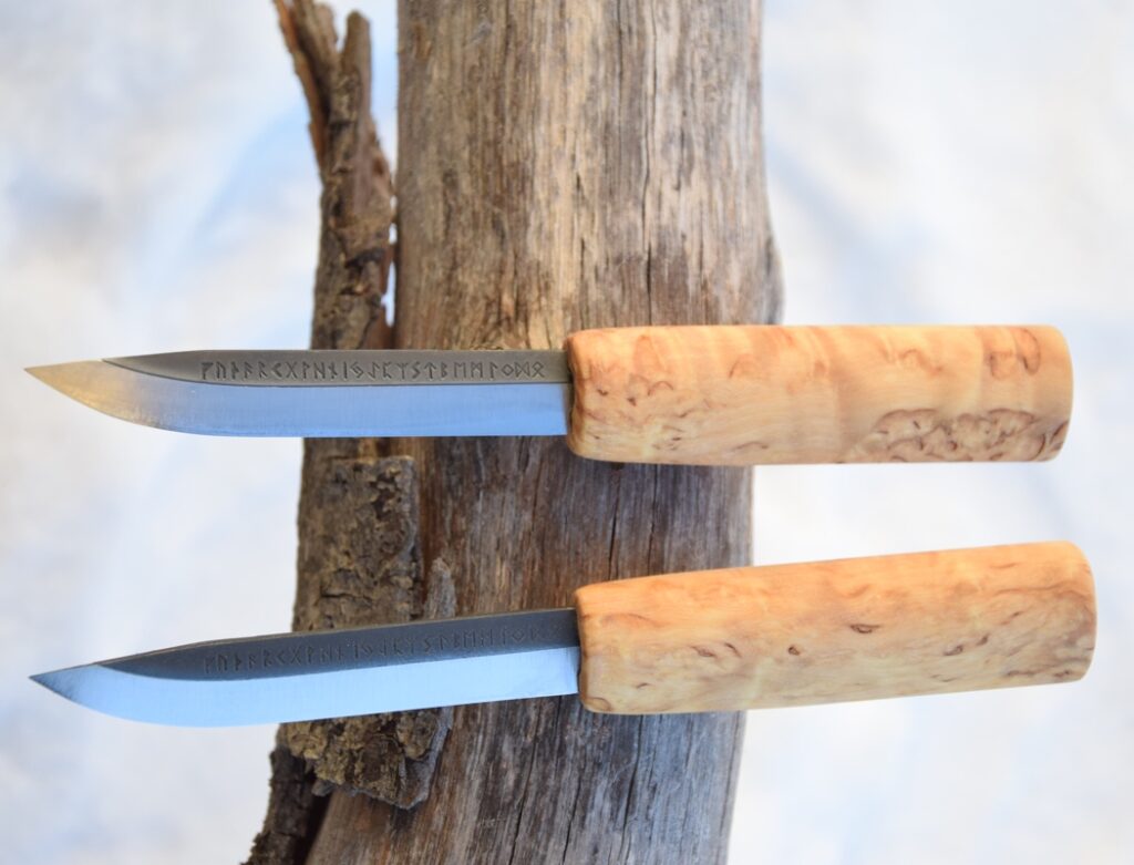 Blade: 80CrV2, edge-hardened (edge 62 HRC, spine 34 HRC), length 105 mm, runic alphabet on side or JSP-stamp on spine. Light handle: Curly Birch, oiled with boiled linseed oil. Dark handle: Curly Birch, torched, oiled with boiled linseed oil. Price: dark 55 EUR, light 65 EUR