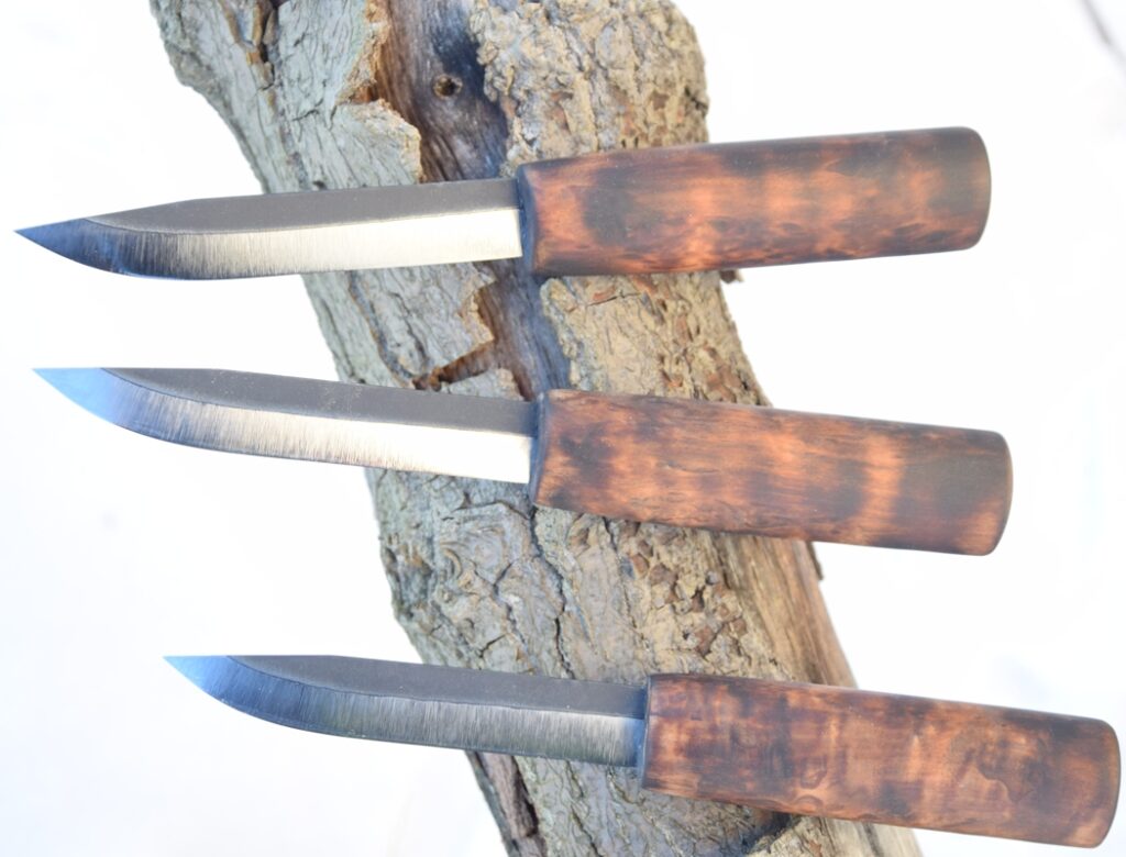 Old-time village blacksmiths forged a wide range of items, including puukko blades. A village smith puukko has a partial tang and no bolsters. In the past, a tang was just hammered in a tight hole, but today, epoxy glue is used. Blacksmiths made handles, but they did not work with leather; therefore, puukkos were sold without a sheath.