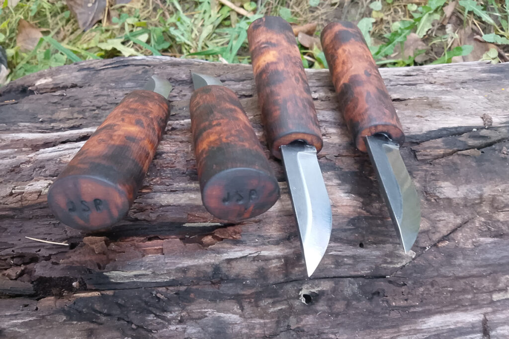 Blade: 80CrV2, double-hardened (edge 63 HRC, spine 50 HRC), length 75 mm. Light handle: Curly Birch, oiled with boiled linseed oil. Dark handle: Curly Birch, torched, oiled with boiled linseed oil. Price: dark 55 EUR, light 65 EUR