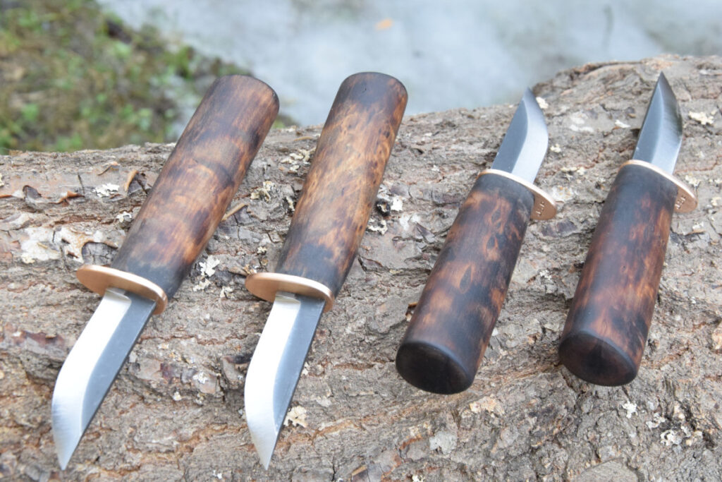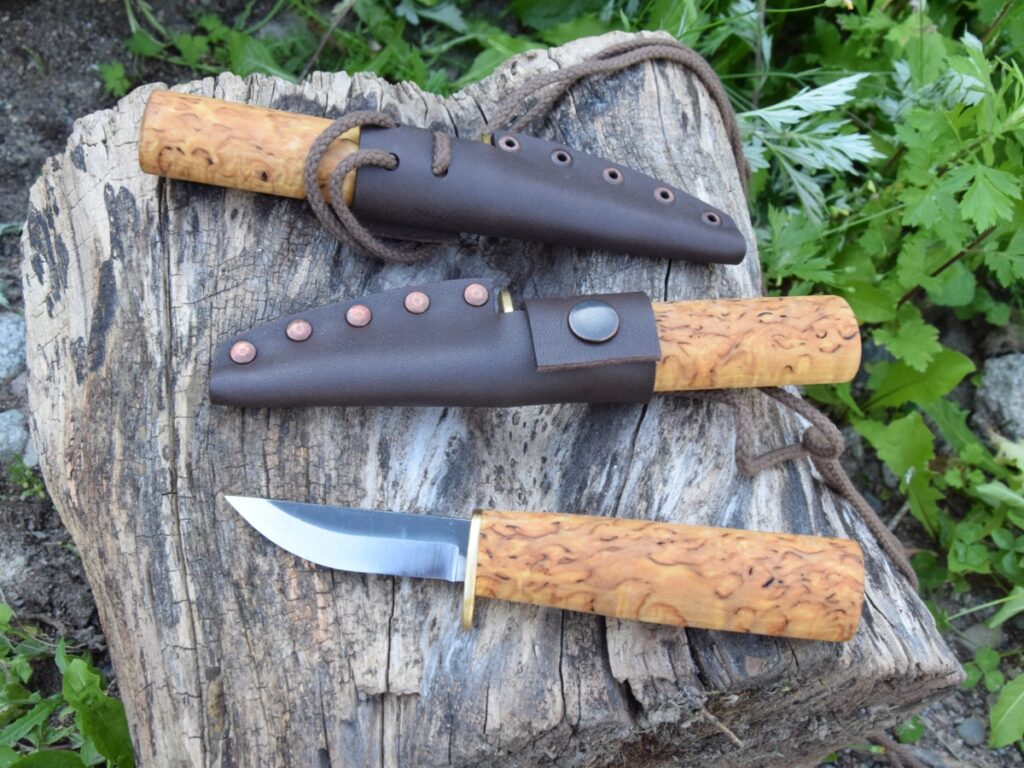 Blade: 80CrV2, double-hardened (edge 63 HRC, spine 50 HRC), length 70 mm. Light handle: Curly Birch, oiled with boiled linseed oil. Dark Handle: Curly Birch, torched, oiled with boiled linseed oil. Sheath: vegetable tanned leather, 2 mm, plastic liner. Price: dark 90 EUR, light 100 EUR